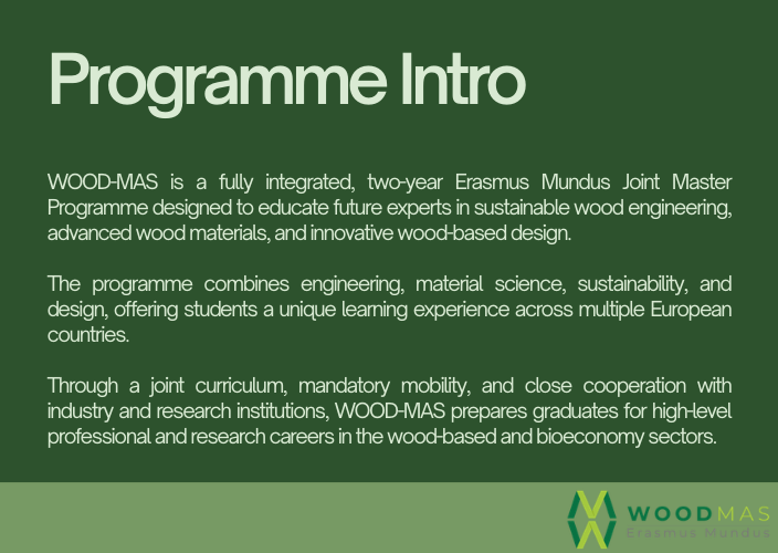 Advanced wood science, engineering, sustainability, digital design, and innovation in one integrated programme.