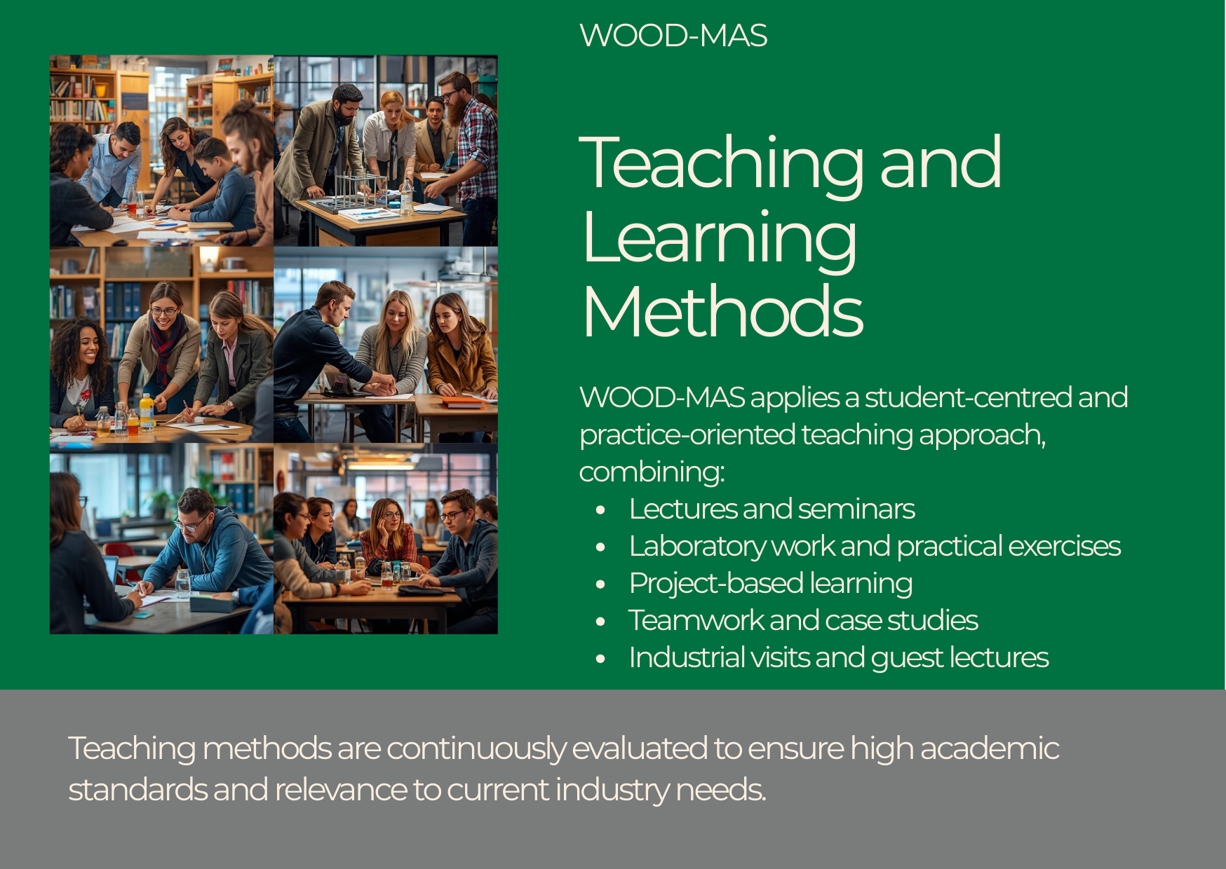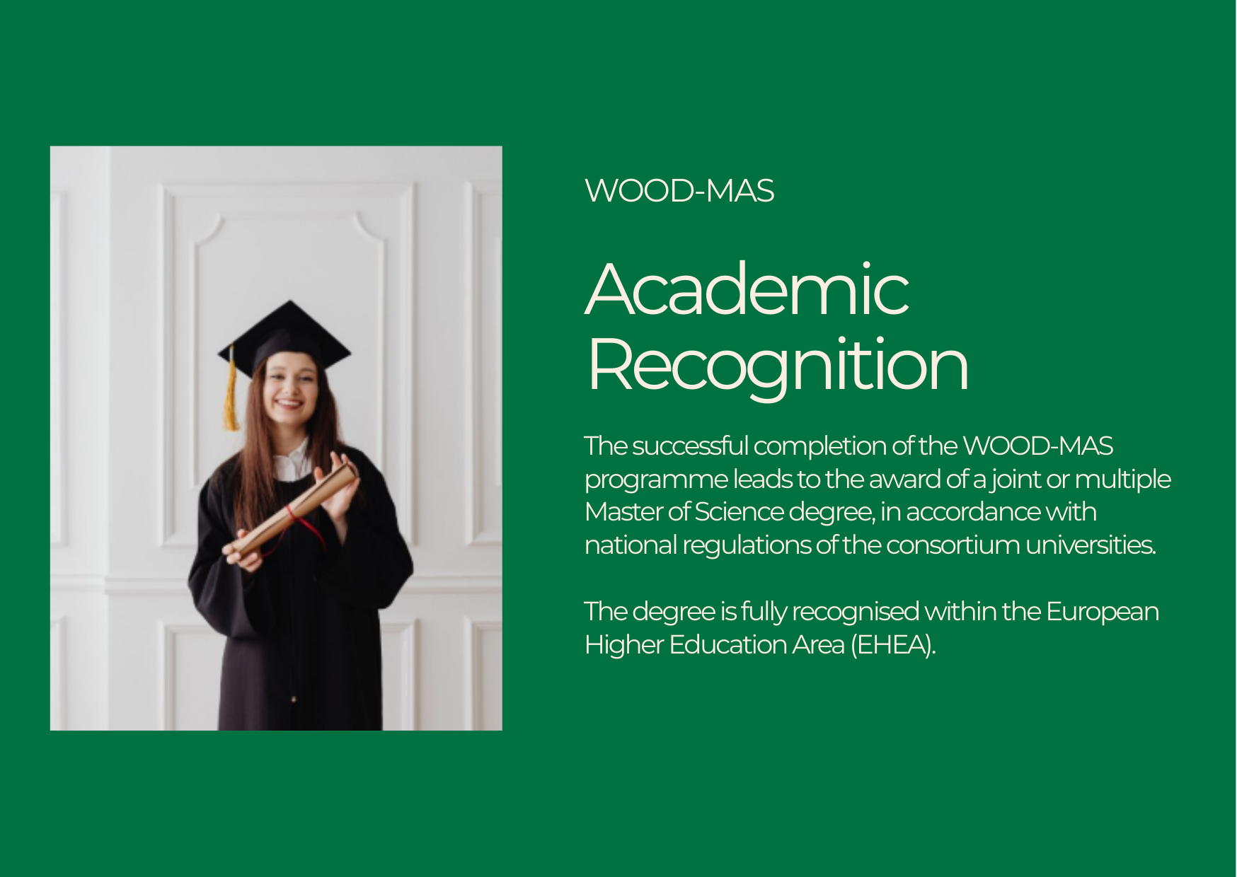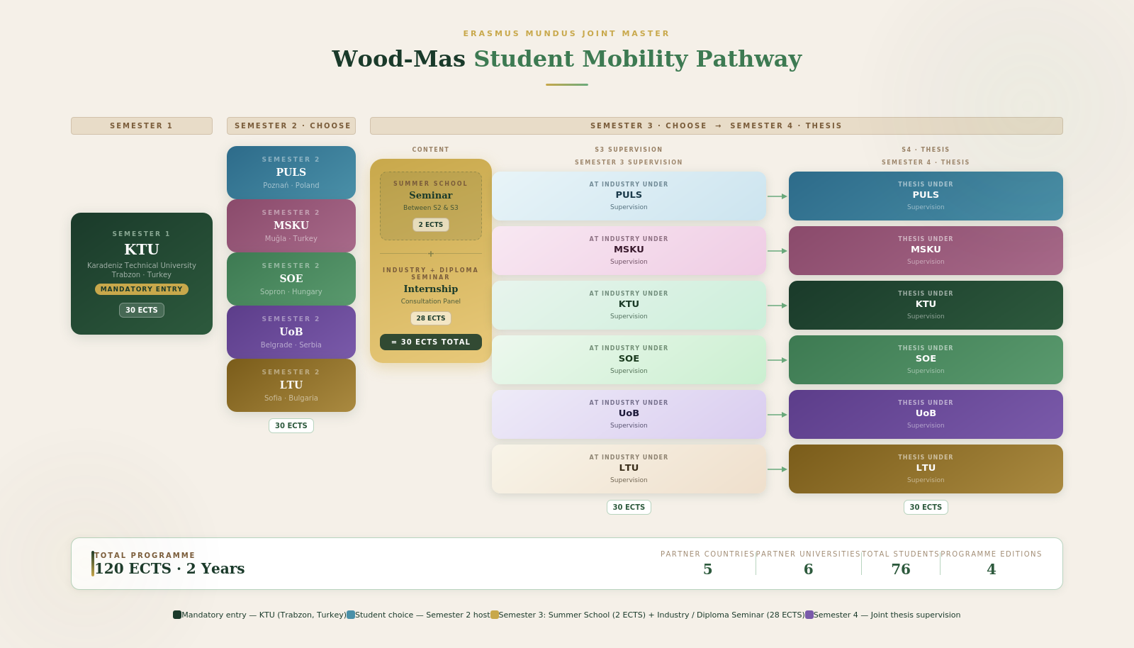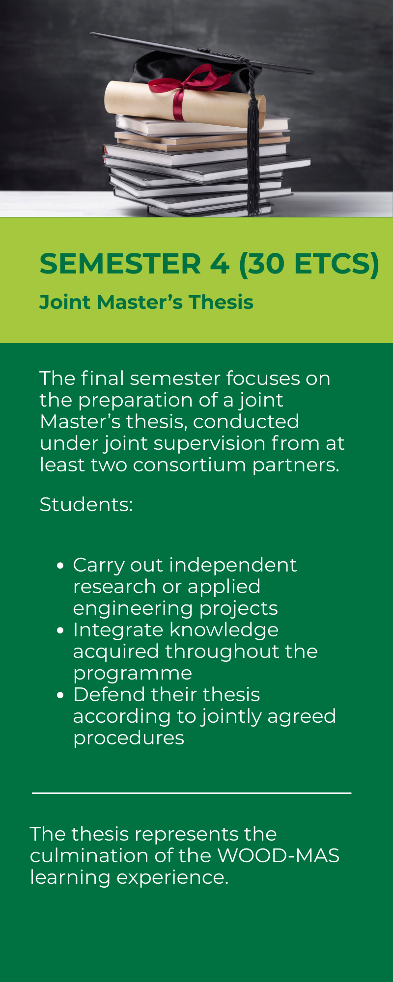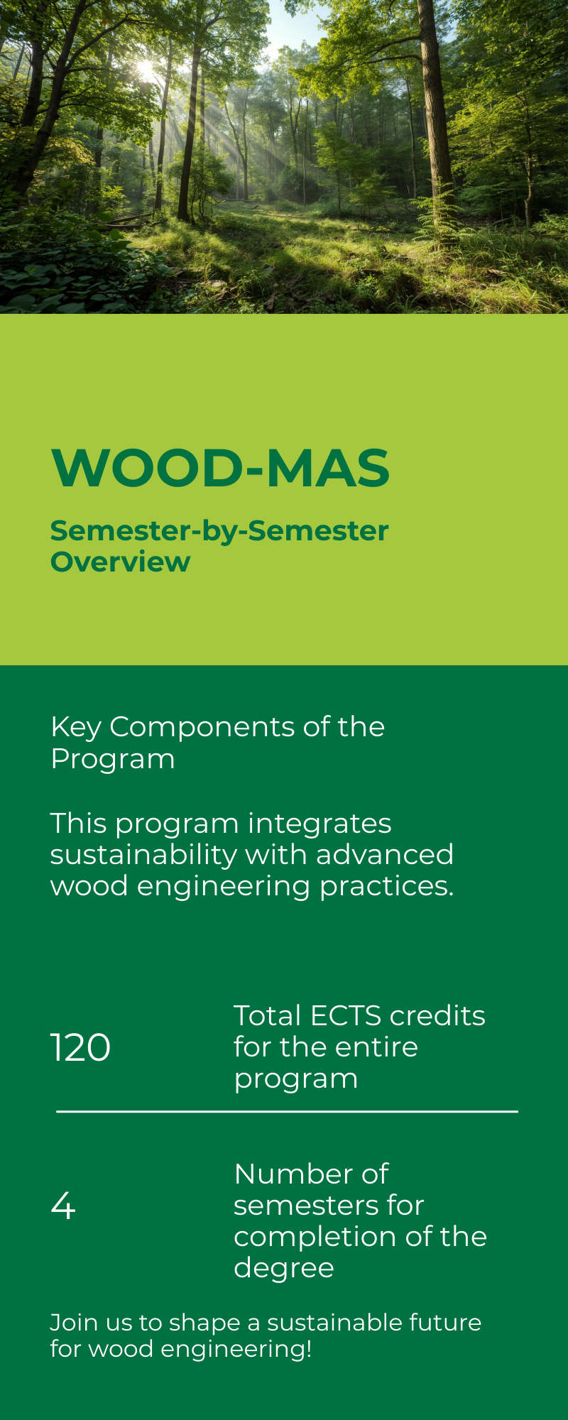 The WOOD-MAS programme follows a joint and integrated four-semester structure leading to a total of 120 ECTS credits.